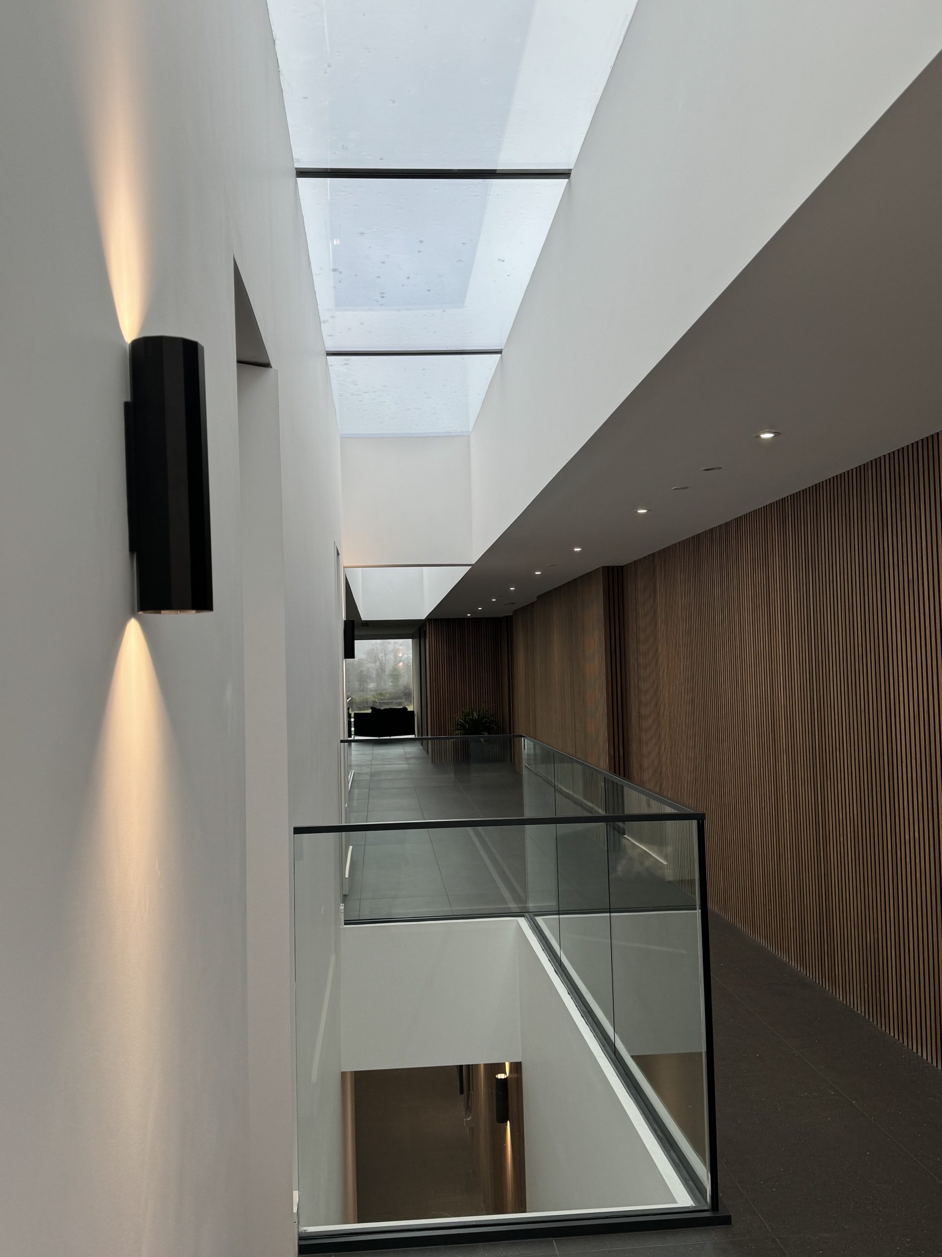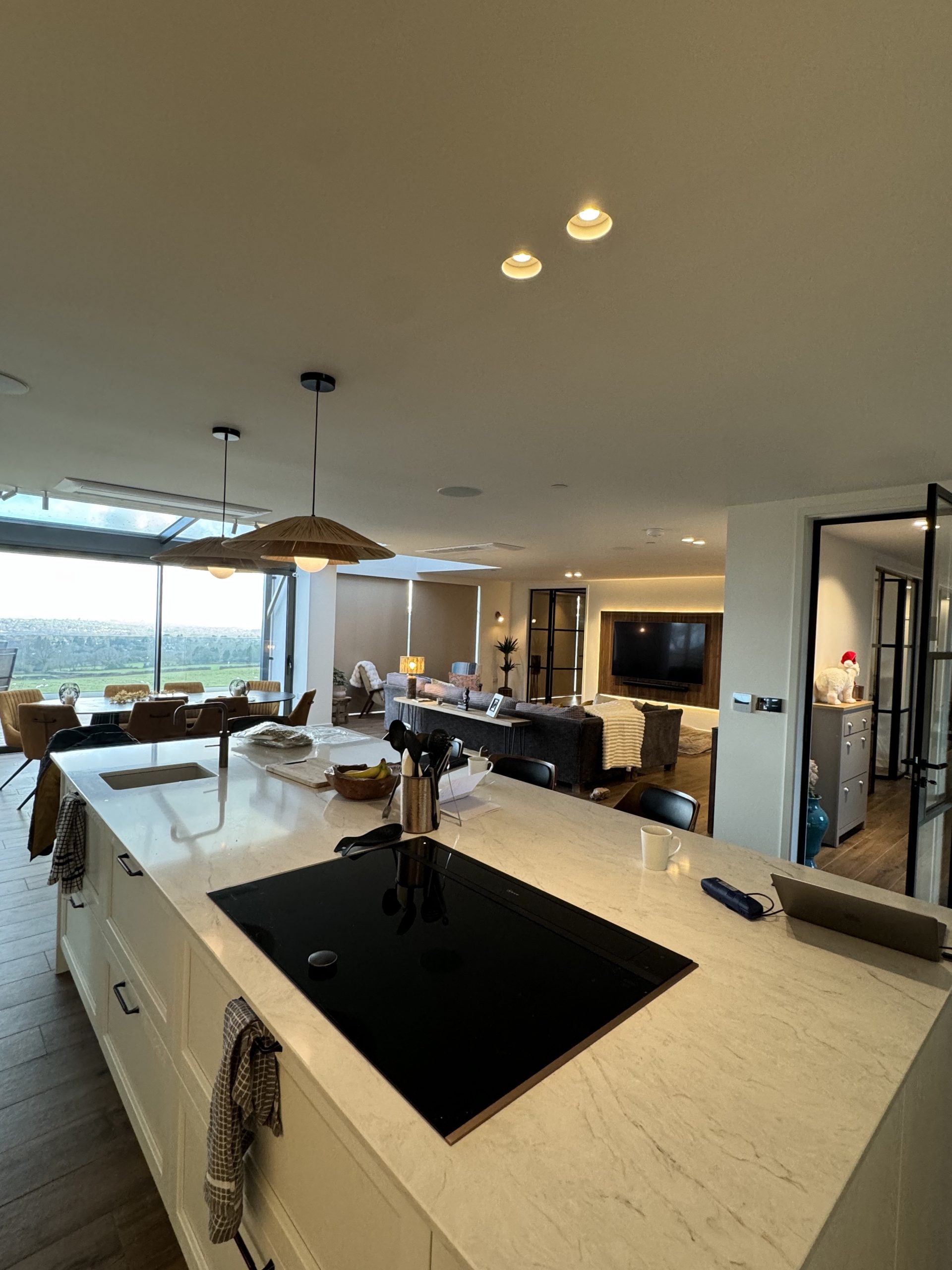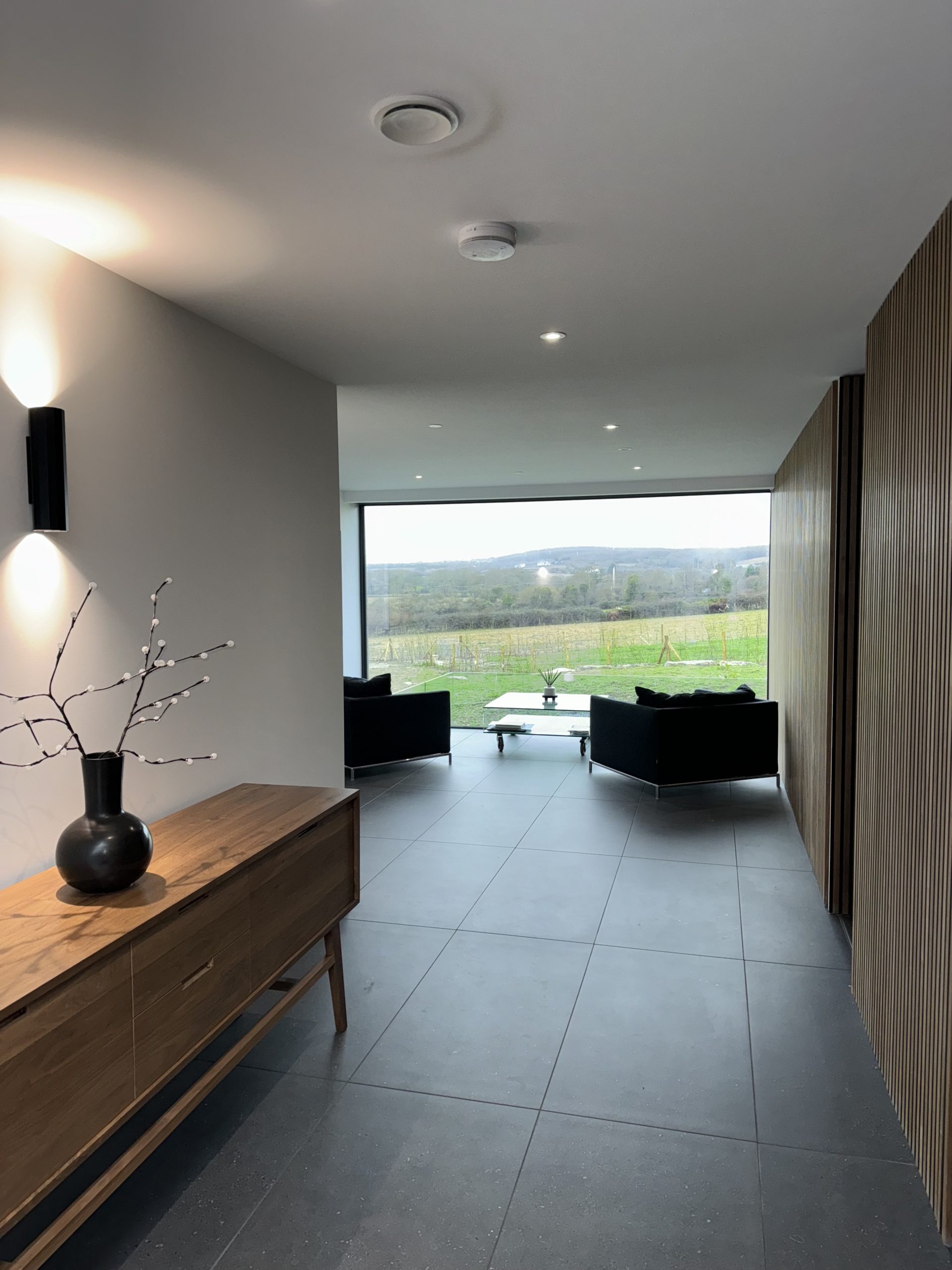 We were trusted with the design and install of the electrical installation. This included the stunning lighting, power, heating control, data and home wifi network, multiroom Audio, EV charging, CCTV and security
