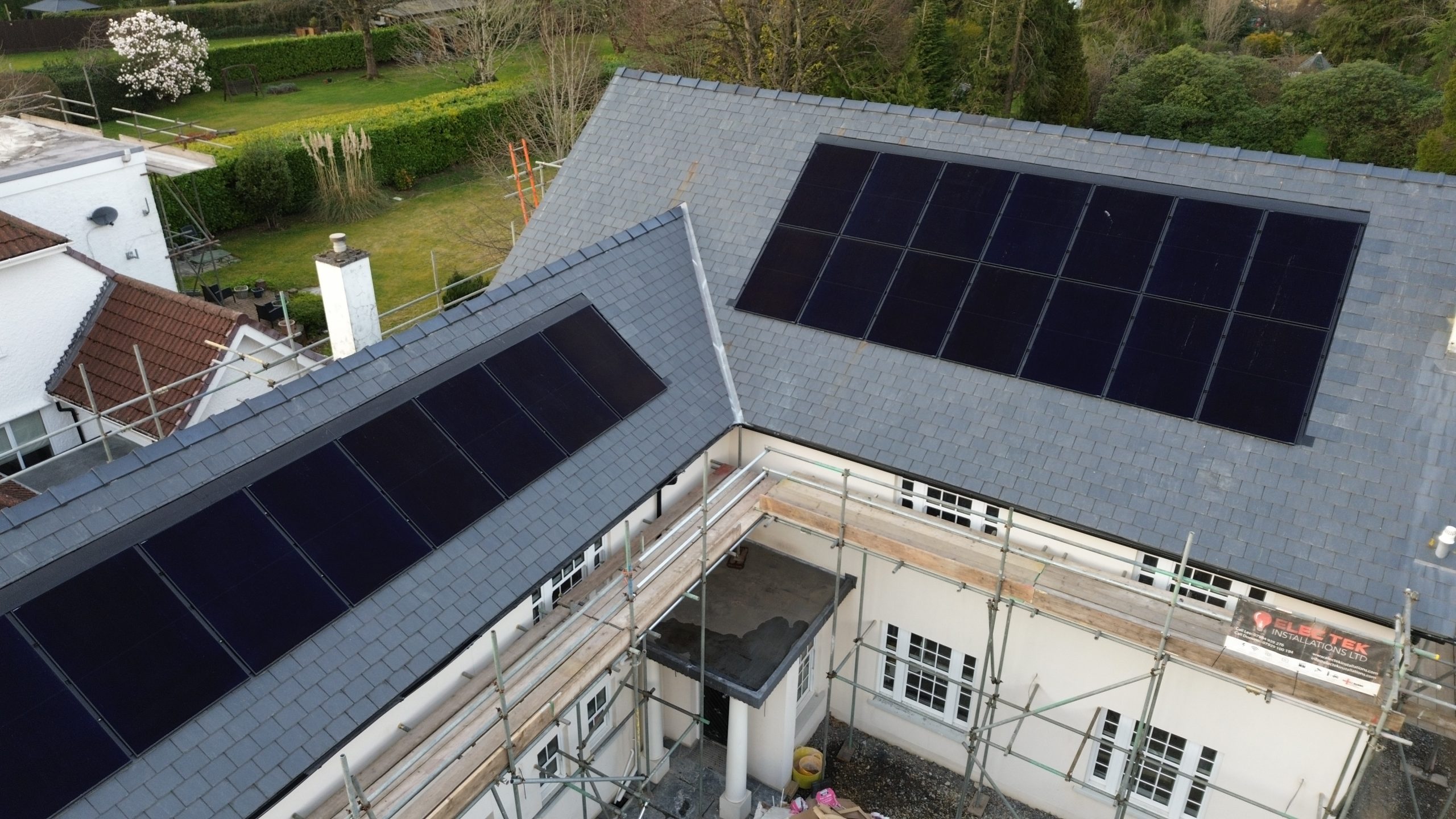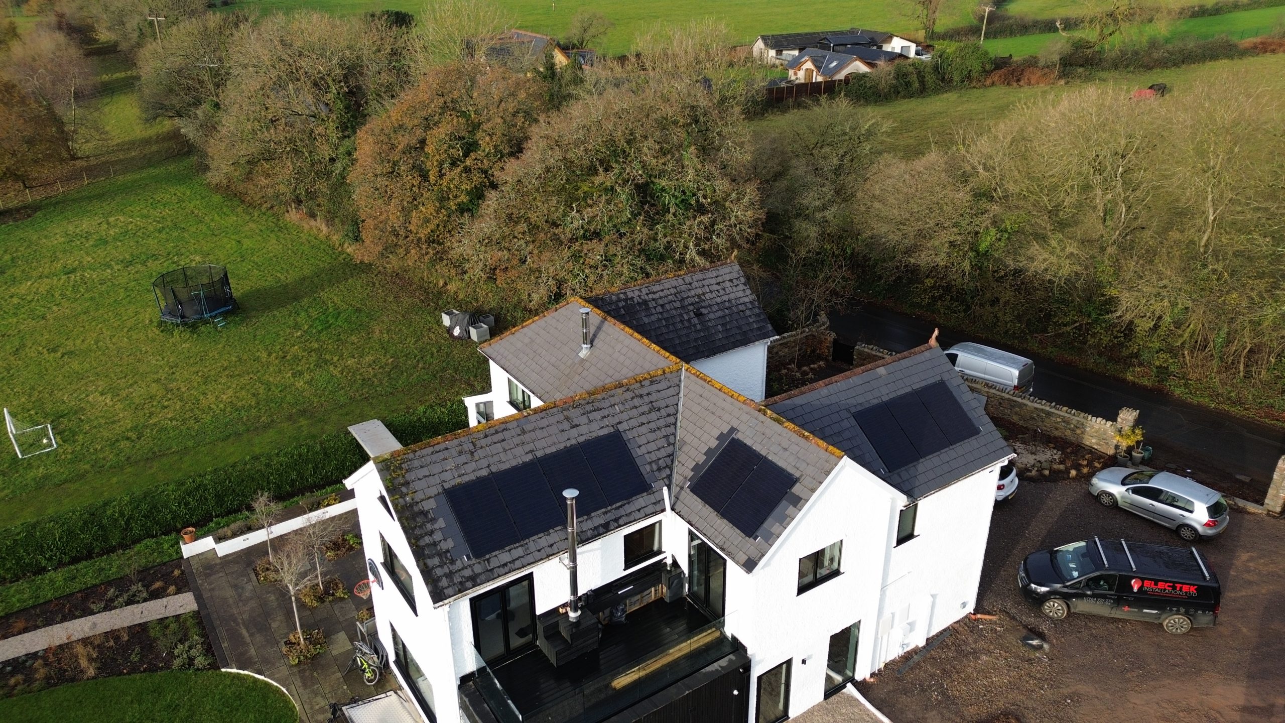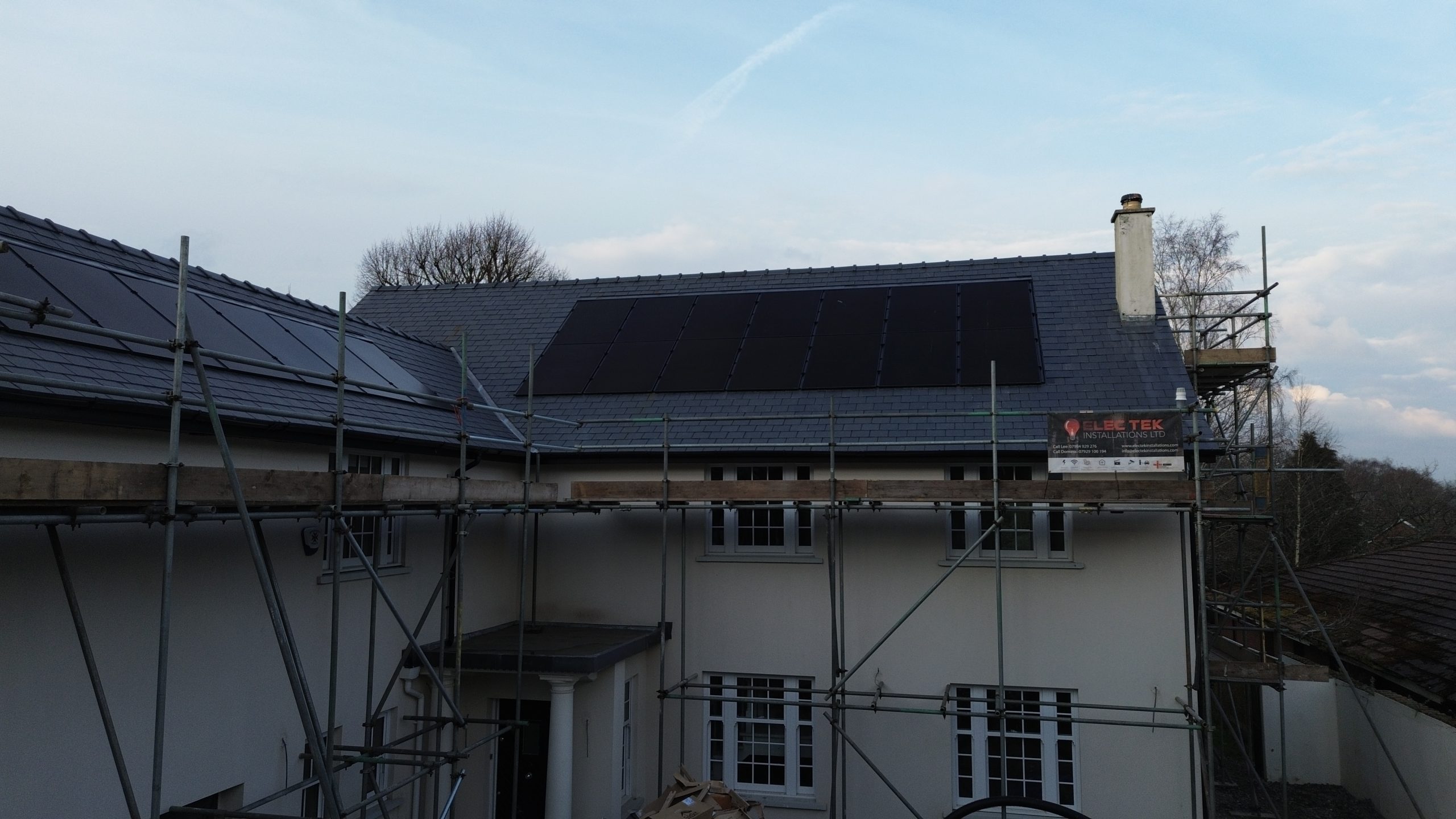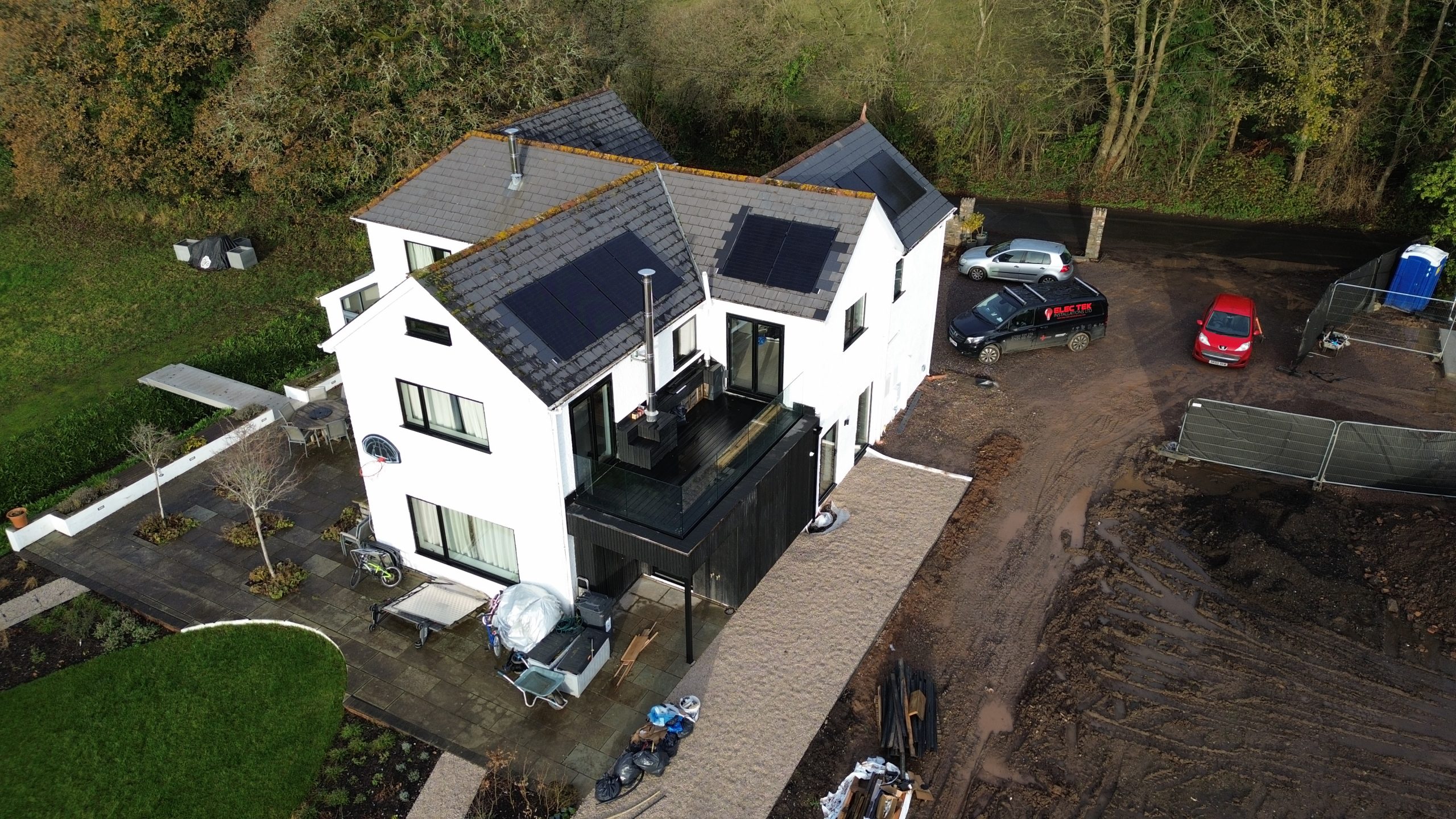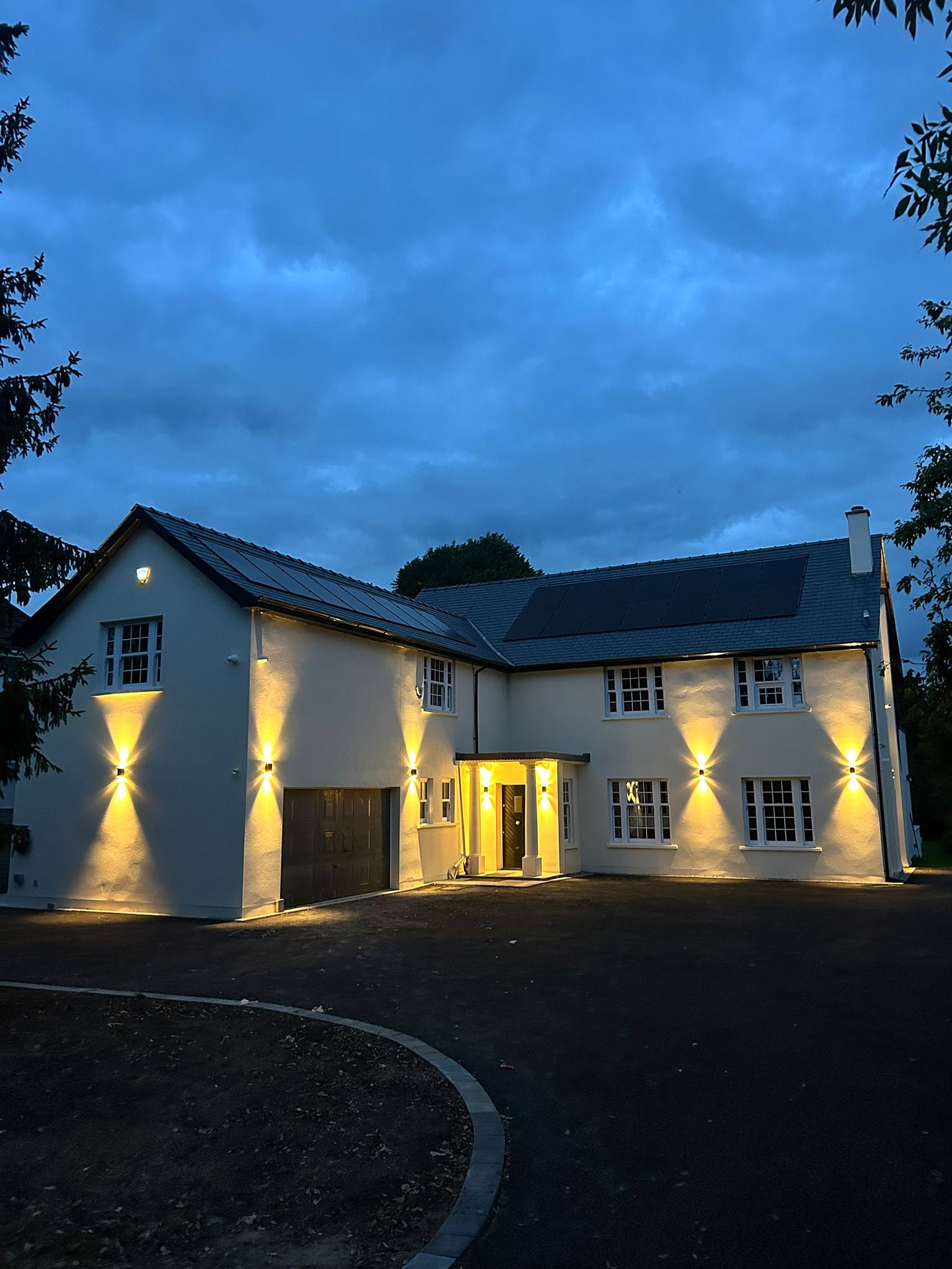 We undertook the renovation of this stunning home in Cyncoed, Cardiff in 2025. We installed a 10KW Solar PV system compromising of In-roof panels at the front of the property and on-roof panels at the rear. The 10KW battery stores any excess energy to use during in the dark hours. We also undertook the full rewiring of the property including lighting, power, Data and WIFI network, CCTV, Intruder alarm, Heating control, Garden lighting scheme and EV charger.